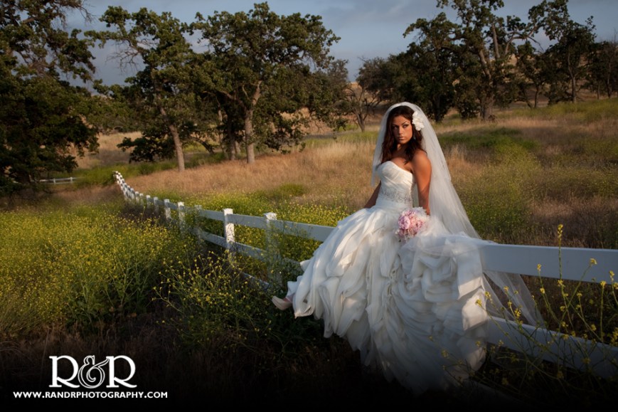 It truly takes a village… Sandra Lopez of J & M Entertainment and The Bellisama Bride Bridal Show called us to do some photos for the new marketing campaign for the August 7, 2011 upcoming bridal show at the Valencia Hyatt. Adriana Cruz Farrell was on board to model a new dress from the Maggie Soltera collection and Sandra & Adriana Farrell came along to TPC- Tournaments Player’s Club- Valencia with us to help. (Check out Dave & Sandra helping Adriana onto the fence) We wanted to catch the beautiful end of the day light so we started at 6pm and needed to be done by 7pm to accommodate everyone’s schedules.